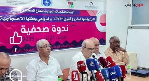 عبد الواحد الحطابي يتلو التصريح الصحفي للهيئات النقابية والمهنية لقطاع الصحافة والنشر في الندوة الصحفية التي نظمت اليوم الثلاثاء بمقر النقابة الوطنية للصحافة بالرباط لشرح رفضها لمشروع قانون اعادة تنظيم المجلس الوطني للصحافة ودواعي تنظيمها للوقفة الاحتجاجية غدا الأربعاء أمام البرلمان. ” وسننطلق في تنفيذ برنامجنا النضالي ضد مشروع هذا القانون التراجعي بتنظيمنا لوقفة احتجاجية مركزية أمام مقر البرلمان صباح الأربعاء 22 أكتوبر 2025 على الساعة الحادية عشرة صباحا. جميعا من أجل تنظيم ذاتي لمهنة الصحافة والنشر مستقل ومنتخب وديمقراطي” من التصريح الصحفي.